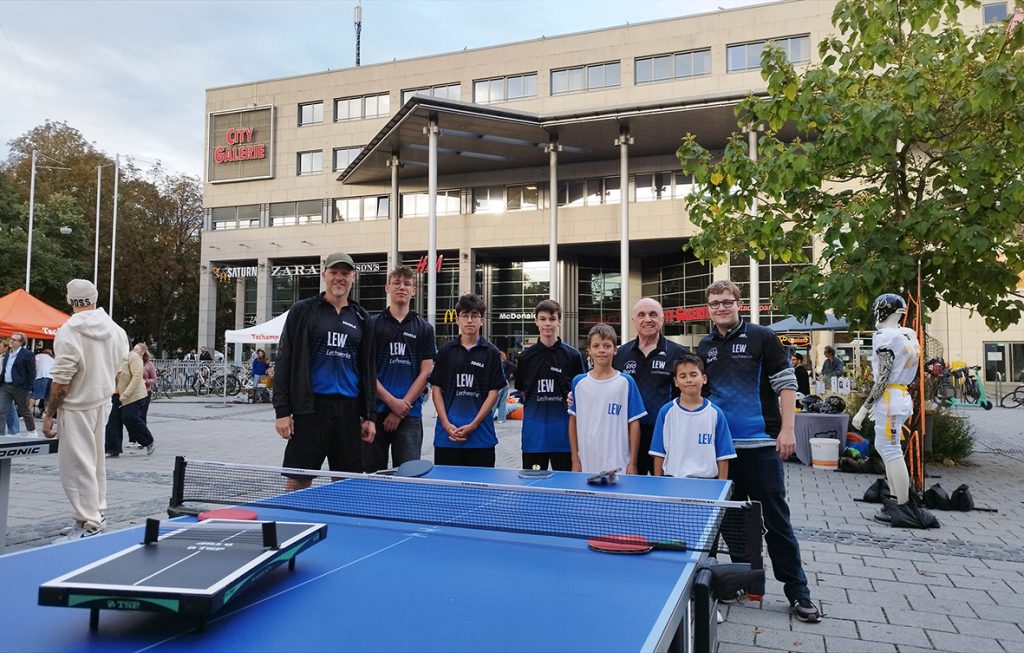 In den Sommerferien nahmen wir in diesem Jahr im Rahmen unseres von den LEW (Lechwerke) geförderten Projekts „Wir fördern Talente“ am Ferienprogramm der Stadt Augsburg teil, das wieder vor der City-Galerie stattfand. Im letzten Jahr hatten wir auch zugesagt. Damals fiel unser Einsatz aber ganz kurzfristig dem schlechten Wetter zum Opfer. Franz Kaps, Inhaber der „TT-Kiste am Vogeltor“ und unser langjähriger Freund und Kooperationspartner, besorgte zwei Original-TT-Tische. Zusätzlich stellten wir zwei Biertische zusammen, um zu zeigen, dass man eigentlich überall mit den Mitteln unseres Sports zusammenkommen kann, wenn nur eine Spielfläche vorhanden ist. Wir stellten in diesem Jahr zusätzlich einen ganz kleinen Tisch zur Verfügung, der auch großen Anklang fand. Die Veranstaltung war zwar zu Beginn buchstäblich etwas „vom Wind verweht“. Aber dies tat der Begeisterung, mit der Jung und Alt durchgehend über Stunden hinweg an allen Tischen spielten, keinen Abbruch. Heuer konnten wir – wie das Foto des kleinen Lennard zeigt – ganz anschaulich belegen, dass unser Projekt „Wir fördern Talente!“ schon die noch ganz jungen Talente anspricht. Es war nämlich mehr als beeindruckend zu erleben, mit welcher Konzentration der erst 2-jährige Junge unter der Begleitung unseres Trainers Olli Gamm die ihm zugespielten Bälle erwartete und zielsicher zurückspielte. Insgesamt war die Veranstaltung auch in diesem Jahr für alle „Postler“ und das neuerlich hoch engagierte Organisationsteam von Tschamp Move um Dennis Galanti vom Jugendamt der Stadt ein voller Erfolg!